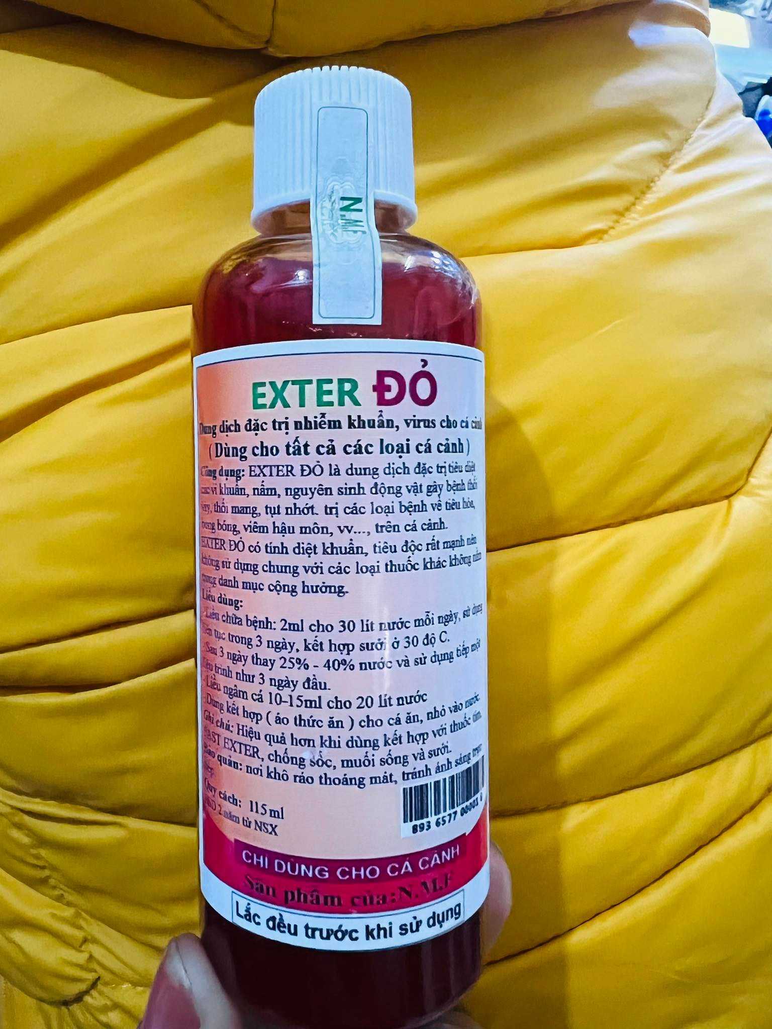 công dụng : exter đỏ là dung dịch đặc trị tiêu diệt các loại vi khuẩn , nấm , nguyên sinhb động vật gây bệnh thối vẫy, thối mang, tụt nhớt, trị các bệnh về tiêu hóa, bong bóng, viêm hậu môn, v.v trên cá cảnh